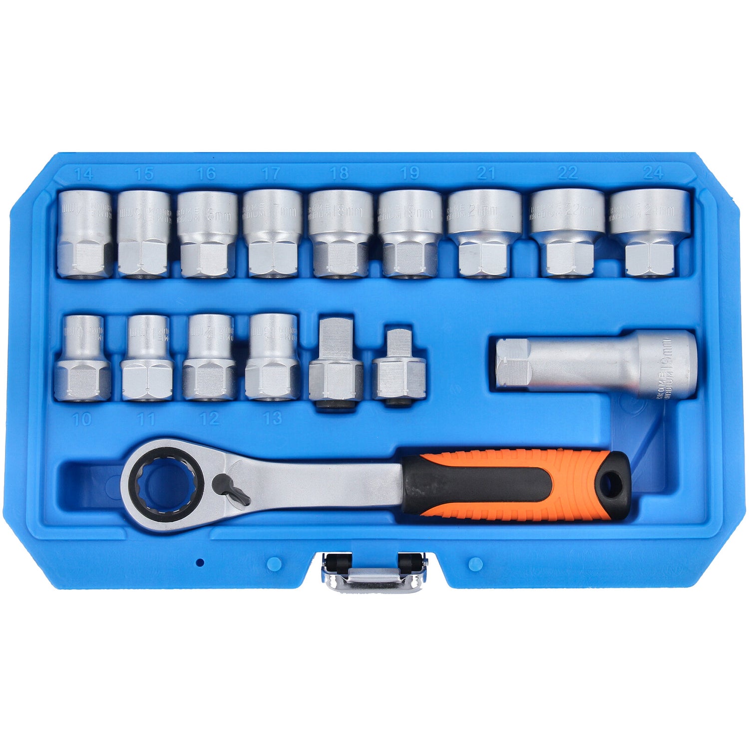 Set di chiavi a bussola passanti da 10-24 mm e cricchetto reversibile da 19 mm 3/8" 1/2" 17 pezzi.