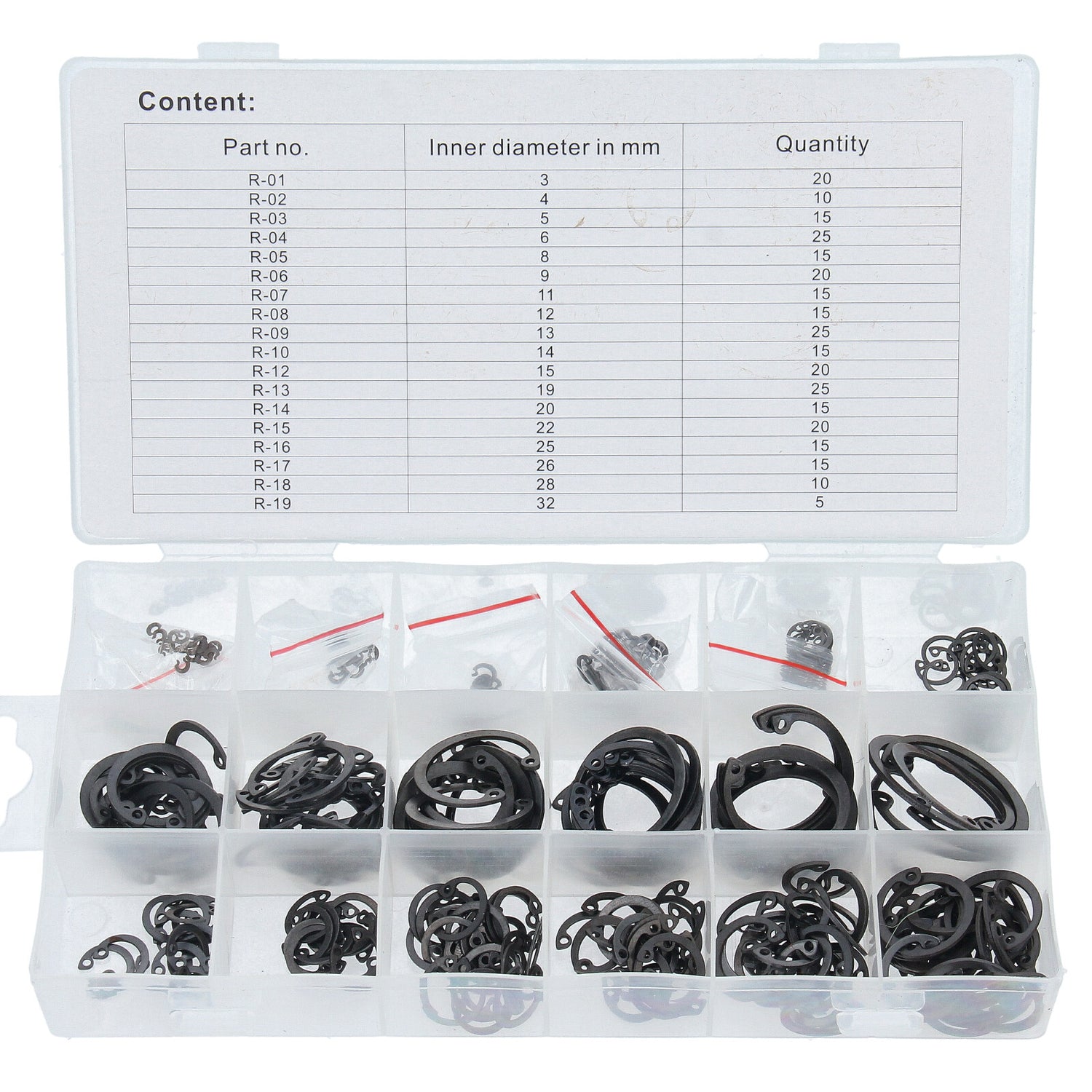 Assortimento di anelli di sicurezza interni, 300 pezzi*5 pezzi con diametro interno 32 mm, 20 pezzi ciascuno da 3, 9, 15 e 22 mm, 10 pezzi ciascuno da 4 e 28 mm, 15 pezzi ciascuno da 5, 8, 11, 12, 14, 20, 25 e 26 mm, 25 pezzi ciascuno da 6, 13 e 19 mm